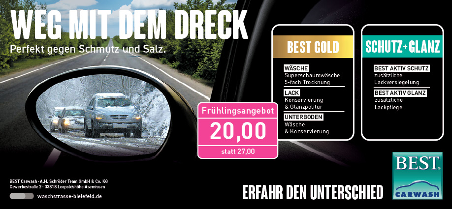 Unsere BEST EXPRESS-Waschstraßen finden Sie in Bielefeld-Leopoldshöhe, Bielefeld-Brackwede und Bielefeld-Sennestadt. Wir reinigen Ihr Fahrzeug nicht nur, sondern schützen es zum Beispiel mit unserem BEST Exklusiv-Programm auch nachhaltig gegen Einflüsse aus der Umwelt: Dank Polymeren, also hochkonzentrierten, chemischen Schutzbausteinen, wird der Lack hochwirksam versiegelt. In unserer Niederlassung in Bielefeld-Sennestadt finden Sie außerdem eine SB-Waschstation, an der Sie Ihr Auto per Hand selbst säubern, konservieren und polieren können.